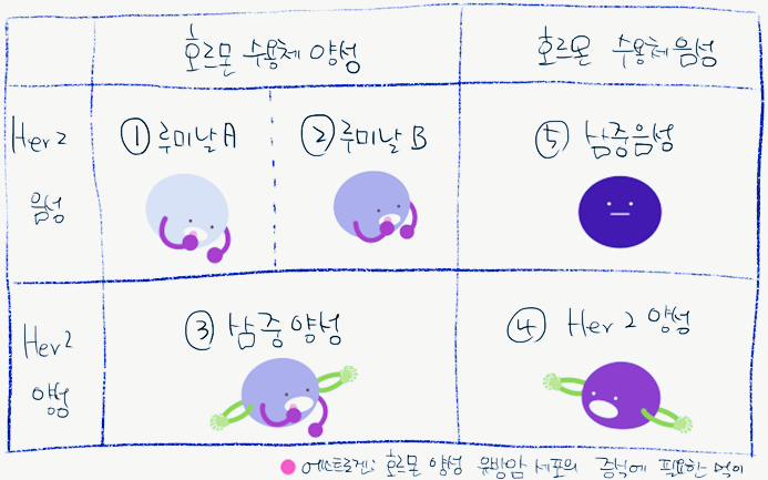 유방암은 에스트로겐, 프로게스트론, Her2의 반응 여부에 따라 5가지의 서브타입으로 나뉩니다.