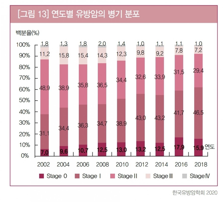 ​ 위 그래프에서 병기 분포를 보면 비교적 종양이 작은 병기에 해당하는 '0기~1기'가 60%, '0기~2기'가 90%를 넘는 것을 볼 수 있지요. 그래서 수술을 먼저 시행하는 케이스가 많은 것으로 보입니다.